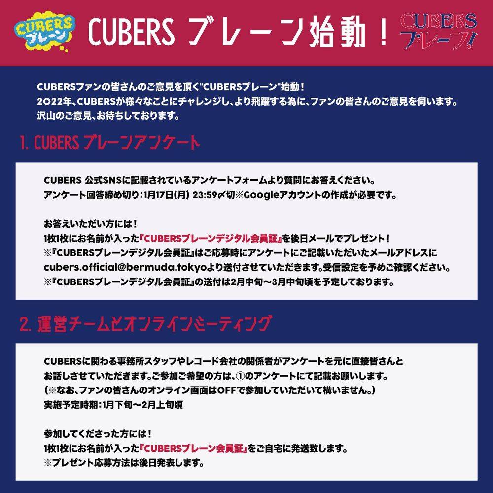 早速、公式HPにてアンケートフォームが公開。回答された方には1枚1枚に名前が入った『CUBERSブレーンデジタル会員証』が後日プレゼントされる。また、CUBERSに関わる事務所スタッフやレコード会社の関係者等の運営チームと直接話をすることができるオンラインミーティングの開催が決定。希望者は全員参加することが可能で、複数回に分けて実施される予定だ。オンラインミーティングの参加者には『CUBERSブレーン会員証』の現物が自宅に届けられる。