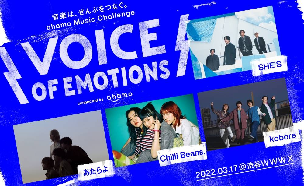 株式会社NTTドコモ(以下、ドコモ)が展開するデジタルネイティブ世代にフィットした料金プラン「ahamo」は、夢に向かって新たな一歩を踏み出す皆さまを音楽を通じて応援すべく、「音楽は、ぜんぶをつなぐ」をスローガンにした『ahamo music challenge』を実施中。その一環で開催する対バン形式の音楽フェス『VOICE OF EMOTIONS connected by ahamo』に、音楽好きな若者を中心に人気急上昇中の実力派若手バンド「Chilli Beans.」 「kobore」2組の追加出演が決定した。