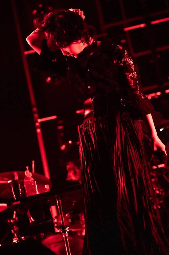 その後、真っ赤なシースルートップスにタイトなパンツスタイルから上下黒のロングスカートにスタイルチェンジした家入は「Silly」「もし君を許せたら」「未完成」など計5曲を情感たっぷりに歌い上げた。そして、「これからも変わらない気持ちを持ち続けてこのステージに立っていきたい。むしろこれからが本番なんじゃないかなって。この10周年のタイミングで、20周年を目指したい、やっぱり私には音楽なんだ!と思えたことはとても嬉しいです。改めて、目指すところにいくためには近道や魔法などはないんだなと思って、地道に毎日を生きよう、今この時を生きようと思いながら、約6年ぶりに西尾芳彦さんとタッグを組んで生まれた曲をここで届けます。」と話し、「Borderless」を力強く披露した。