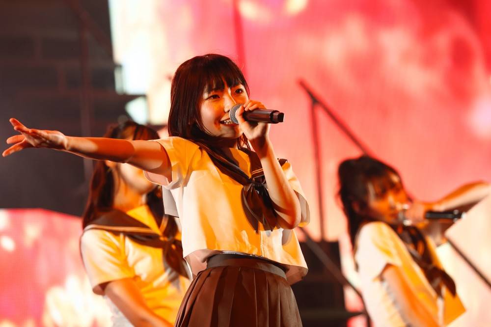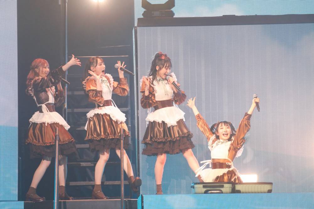 続く「クルクルかき氷」では夏らしいグッズを持って可愛らしいメンバーの姿と、恒例となったウェーブの演出でオーディエンスとの一体感を作り上げた。さらにTikTokで話題 となり1億回視聴を突破した「てゆーか、みるてんって何?」が始まると、会場のペンライトが一気に振られ、センターを務める本田が穴から引っこ抜かれて登場する演出で笑いを誘いながらも、その大バズりっぷりを見せつけた。最後にドヤ顔で決めた本田を、鈴木が両手で大きくよけると「ポニーテール キュルン」がスタート。センターの鈴木が、会場を圧倒的な可愛い空間に作り上げ魅了した。