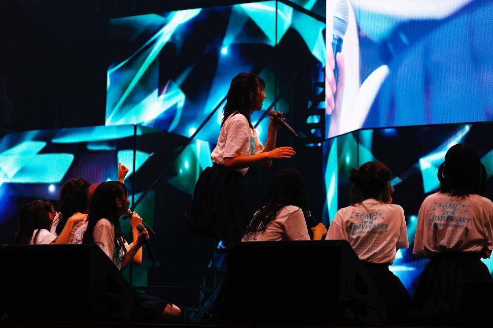 最後の曲「虹が架かる瞬間」では休養中の櫻井ももが歌うパートをあえて“誰も歌わない”演出となっており、冨田が話したように櫻井の復帰を待つかのような、もも色のスポットラ イトを11人が囲む演出がなされた。最後に川中子から本日の感想があり「本日は3周年ということで、ずーっと前から応援してくれてる方も、最近好きになったよーって方も、全員で今日こうして皆さんと一緒の空間でお祝いできたことが嬉しいです!」と笑顔で話し、本編が終了した。