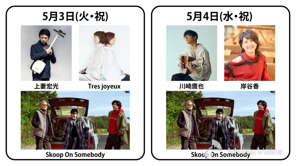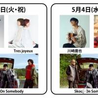 5月4日(水・祝)は、一度聴いたら忘れられないハスキーな歌声が魅力で、TikTokでも話題シンガーソングライター川崎鷹也、5月からは3年ぶりのバンドツアーも決定している岸谷香に加えSkoop On Somebodyの3組がそれぞれ登場する。