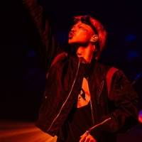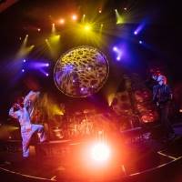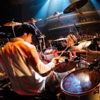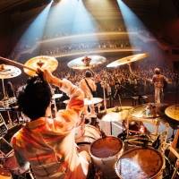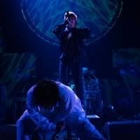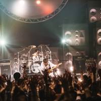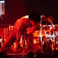スタッフの遊び心から、その土地に因んだキャラクターがレーザー光線で描かれるのが定番化していた今ツアー。この日は大阪府の公式マスコットキャラクター・もずやんと、道頓堀の巨大看板で知られるグリコのあのマークが登場。2度目のMCはそこから大阪トークへと発展した。そしてMC明けから空気が一変。『SUCK MY WORLD』のアートワークを彷彿とさせる円形のスクリーンが登場すると、舞台セット全体にモノクロのアニメーションが映され、バラード「透明な雨宿り」が演奏された。アニメーションは孤独と喪失感に打ちひしがれる少年の姿を捉えるもので、映像との相乗効果もあり、鋭いバンドサウンドが少年の心を刺す雨のように感じられる。その後は少年の内面に潜るように「PSYCHOPATH」、「Naked」へ。ぐしゃぐしゃになった心、ギリギリの精神状態を2曲で表現したあとは、螺旋階段を下る少年の映像をバックに、ステージに一人残った山中がうなだれながら「From Dusk Till Dawn」を歌う。