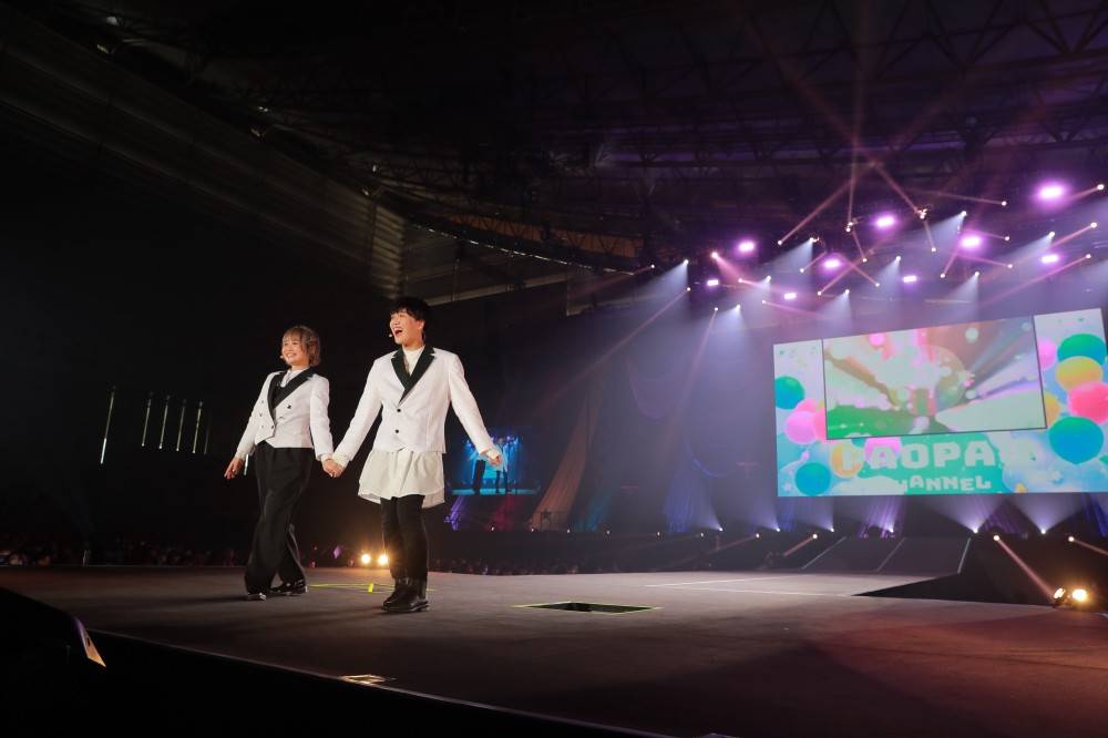 画面に映像が流れ、@小豆とぶんけいがいつもの撮影部屋にいる……と思いきや、ぶんけい曰く会場内のフォトスポットにいて、今からステージに移動するとのこと。そんなサプライズ要素を挟んだのち、パオパオチャンネルの大切な第三のメンバー「パオぞう」が現れ、二人の登場まで会場を盛り上げた。その後、@小豆・ぶんけいが別々にセンターステージから登場。「これからみんなの元に行きたいと思います!」と言い、それぞれが時間差で、パオぞうが運転するトロッコに乗って客席へ。