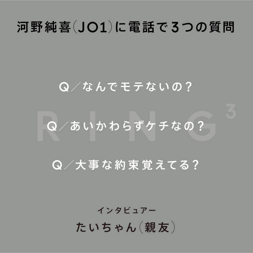フォトニュース JO1河野純喜に電話で3つの質問、YouTubeコンテンツ「RING3」初登場 電話で3つの質問 みんなの意見は?コメントを見る 関連写真・動画 写真一覧 みんなのコメント コメントを書く(ユーザー登録不要) この写真の記事を読むJO1河野純喜に電話で3つの質問、YouTubeコンテンツ「RING3」初登場 前の写真を見る →