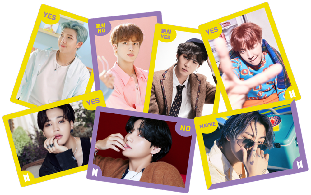 回答の予想は、「YES」「NO」「絶対YES」「絶対NO」「MAYBE」のスペシャルアンサーカードの中から選んで提示。スペシャルアンサーカードは50枚全てBTSメンバーの写真付き。