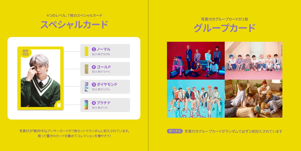 スペシャルアンサーカードの中には、BTSメンバーのグループフォトカードが使われている「絶対YES」カードが各セットに1枚だけ封入されている。グループフォトカードの「絶対YES」カードは全4種あり、どのフォトカードが入っているかは開けてからのお楽しみ。また、コンステラージャパン公式サイトで購入すると、限定特典としてオリジナルフォトカードのプレゼントも。