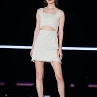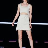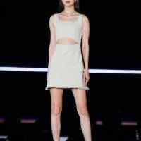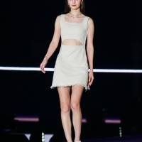 「EMODA」ステージのトップバッターを務めたマギーは、アイボリーのスイッチングコンパクトワンピースを着こなし。ウエストをさり気なくチラ見せし、ミニ丈で美脚もヘルシーに肌見せ。デコルテラインが美しく映えるスクエアネックも印象的だ。