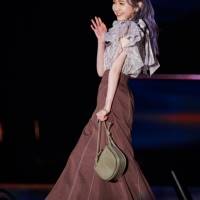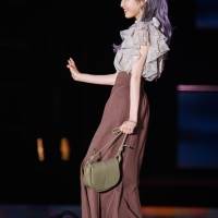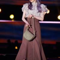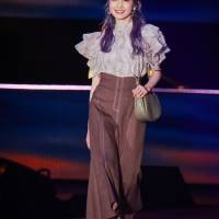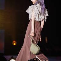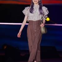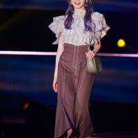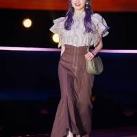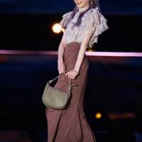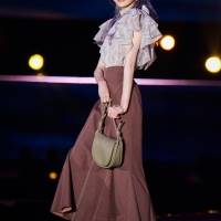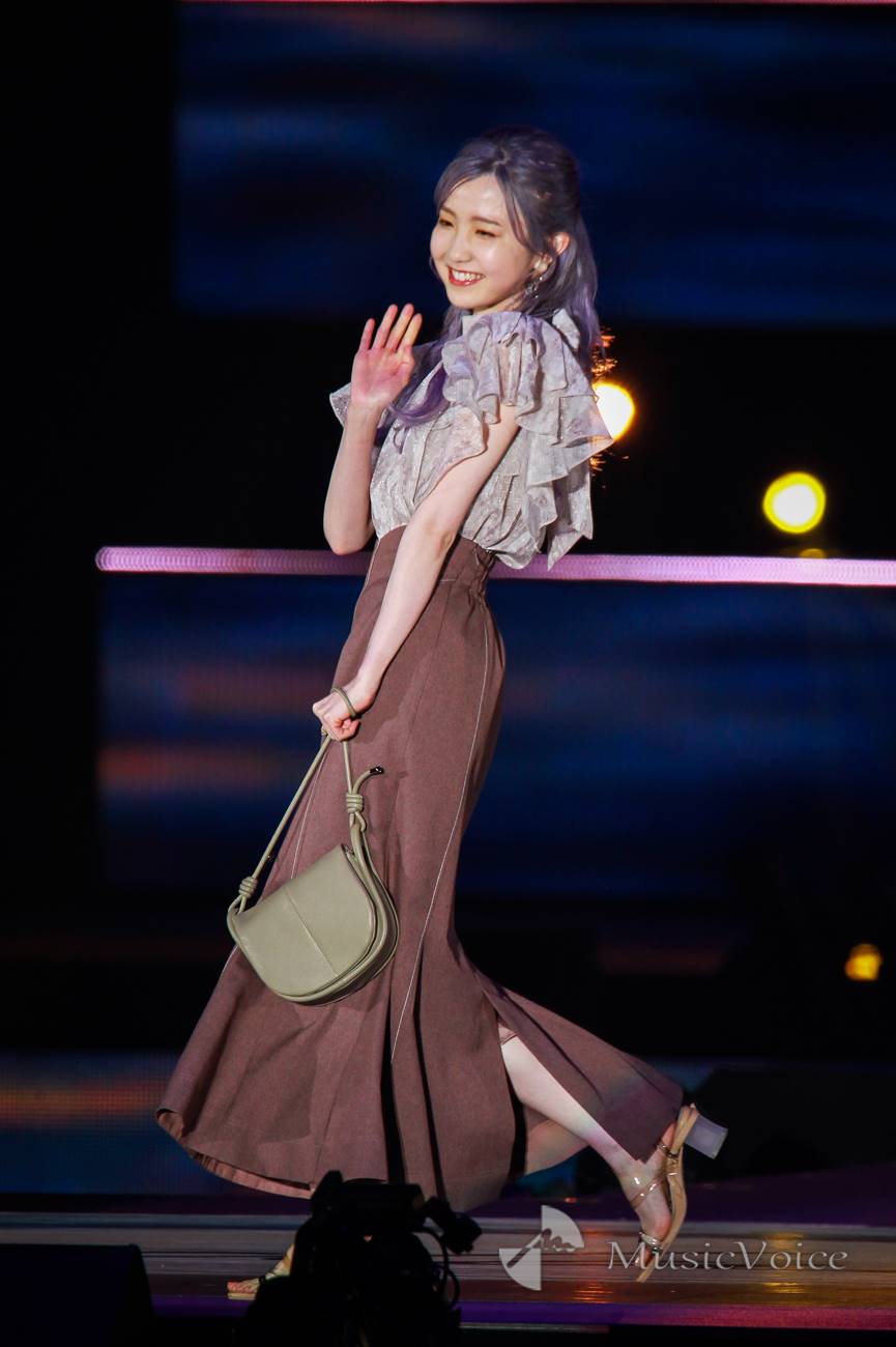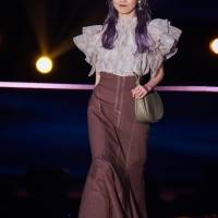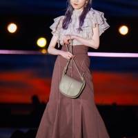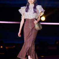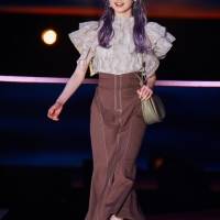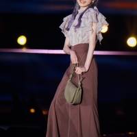 『Rakuten GirlsAward 2022 SPRING/SUMMER』。「dazzlin」ステージに登場したAKB48本田仁美。フリルアソートリボンブラウスとステッチラインマーメイドスカートを着こなした(撮影・木村武雄)
