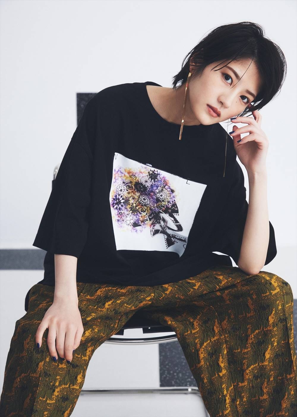 ボディは、ブラックとホワイトの2色展開。シルケット加工を施したコットン100%のボディは、程よくハリのある安心感ある素材感で、着用時の形も綺麗に演出。男女問わずユニセックスで楽しめる1着となっており、サイズは0~2の3サイズ展開。販売サイトでは身長157.7cmの若月が0~2の全てのサイズを着用したスタイリングが掲載されている。