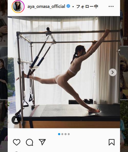 大政は「しぶりにトレーニングのお写真を。今年は少し回数を減らしながら週1、2回を目標に!去年12月から行き始めた」とし、ピラティスで頭の中がクリーンになった上に身体が整い前向きになれたと報告。