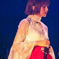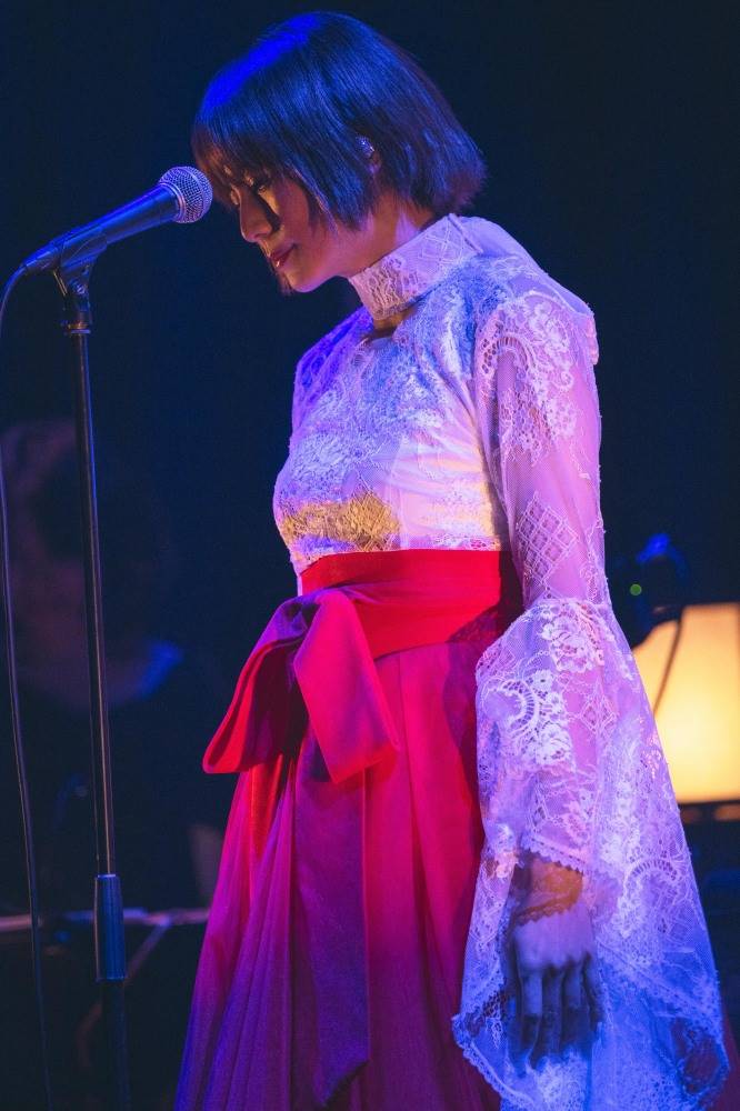 ライブの後半に入ってからは、真っ白なレースのトップスと巫女のような緋袴風スカートに着替え、3rdシングル「眠レナイ夜ハ眠ラナイ夢ヲ」のカップリングで、来ぬ人を待ちながら月を眺め、やがて夜明けを迎える「浮雲」に続き、ドラマ「世界の中心で愛をさけぶ」の主題歌として多くの人に親しまれている「かたちあるもの」では、心の奥底から湧き上がってきたような美しくも力強い歌声を響かせた。そして、歳を重ねるごとに自分自身や楽曲が育ち、成熟し、さまざまな捉え方ができるようになったとしみじみと語りかけた彼女は、追憶をテーマにしたピアノバラード「My Perfect Blue」を歌唱。大きな愛で会場全体を包み込むように本編を締めくくった。