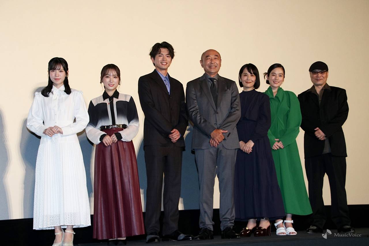 映画『向田理髪店』完成披露上映会に出席した左からHKT48運上弘菜、HKT48矢吹奈子、白洲迅、高橋克実、富田靖子、筧美和子、森岡利行監督(撮影=松尾模糊)