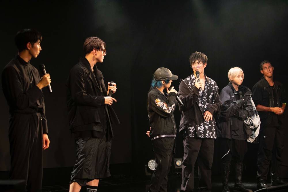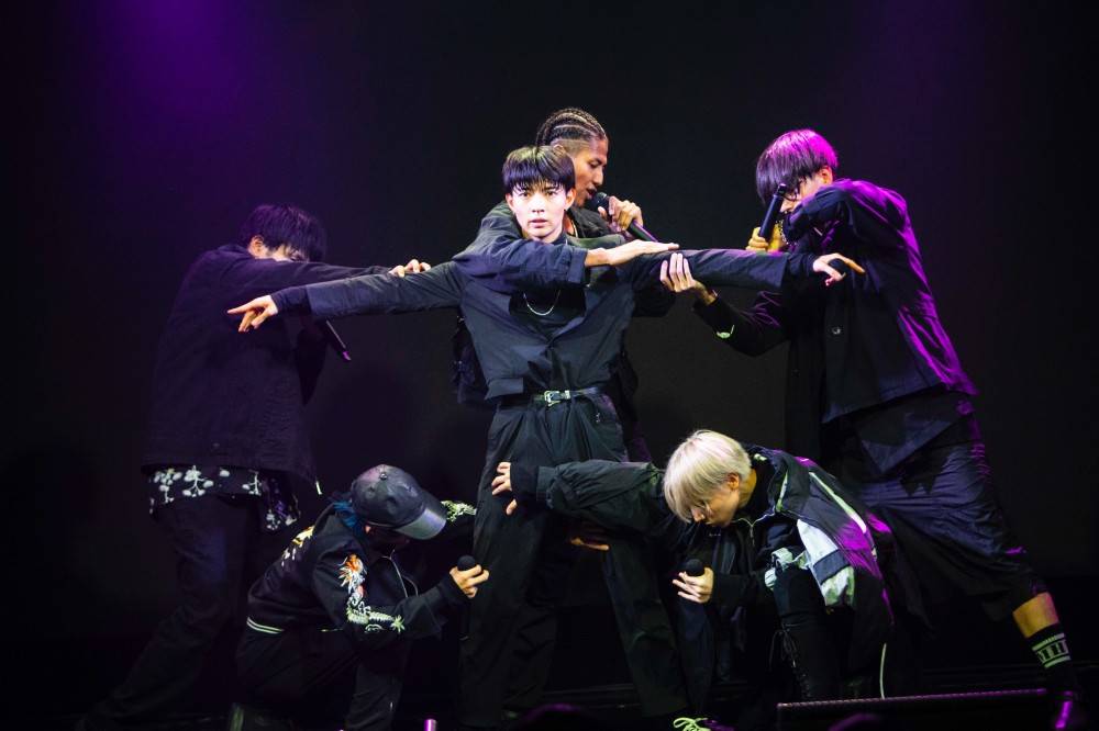そのまま「Hazed Reality」のパフォーマンスに展開し、楽曲の世界観をボーカルに加え、コンテンポラリーダンスを思わせるような演劇的ともいえるダンスで提示していく。そしてKOYAとRIONのラップがその空気を一変させるように切り込む「Lucid Dream」。セカンドバースでのJOSHとYUIのタイトなラップも含め、ボーイズグループらしいタフなアピールで観客を惹きつける。