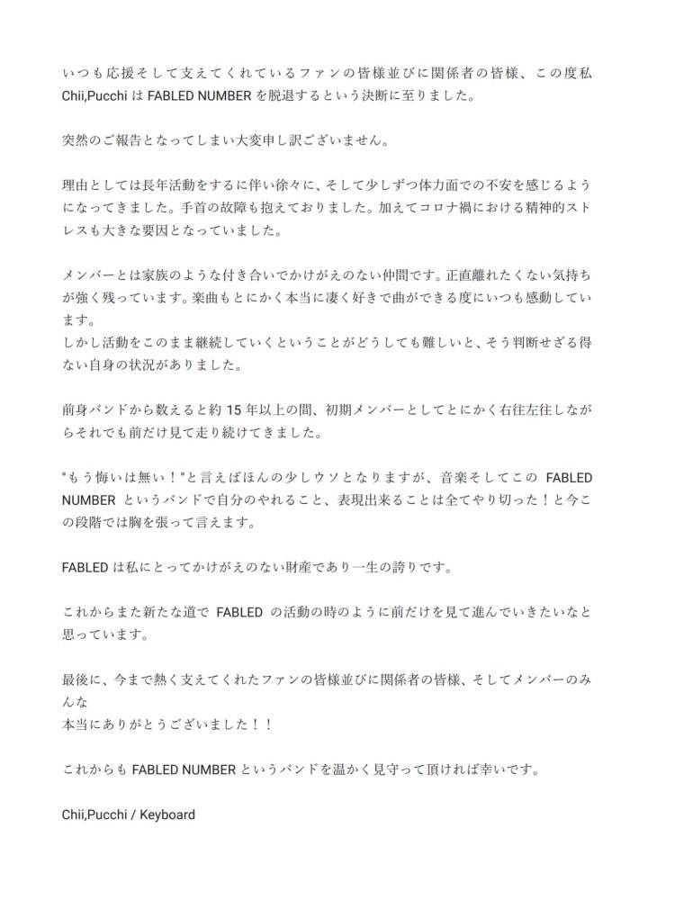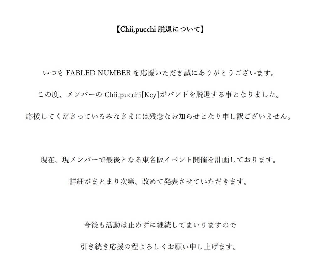 FABLED NUMBER、紅一点のオリジナルメンバーChii,pucchi[Key]脱退を発表