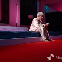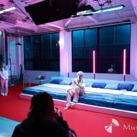 ベッドの後ろに、ピンク色のLEDバーライトが3本。ブティックホテルのような雰囲気だ。そのベッドに腰かけて歌う。そこに志田愛佳、MIO(ミオヤマザキ)、ヘラヘラ三銃士がフレームインする。ワンカット後にモニターを見て目線などの細部を監督とチェックしていく。先ほどはとは異なり真剣な表情だ。リップシンクのシーンでも、流す曲の音量を「もう少し上げて欲しい」とリクエストしていた。