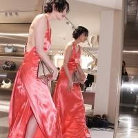 背中が大きく大胆に開いたピンクのドレス。「珍しく春らしい色にしました。上質なサテン生地で、ピーカブーがモダンに進化してそれとマッチしています」