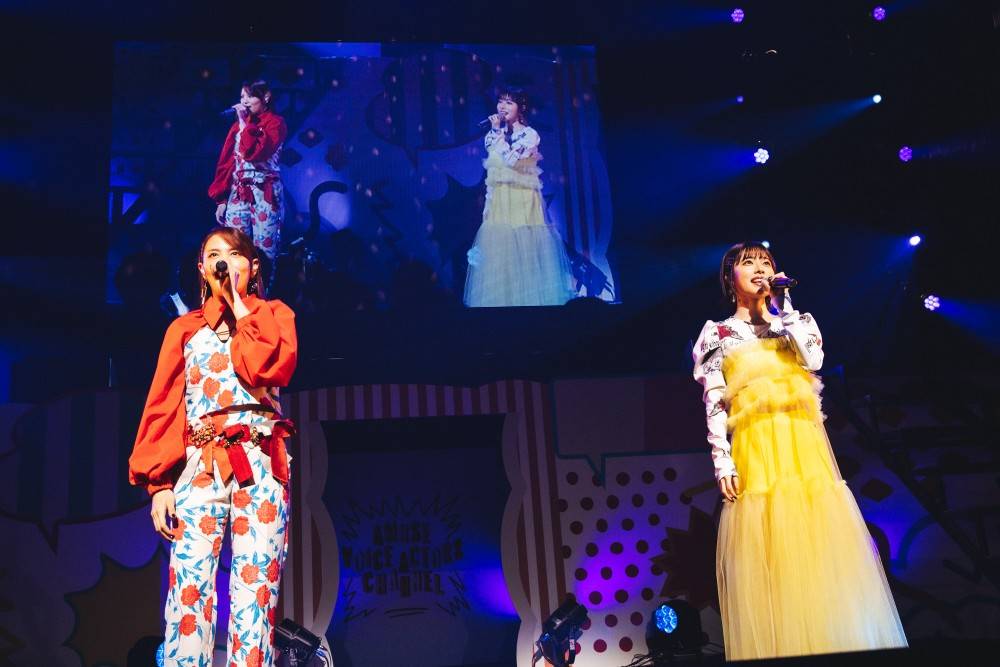 幕開けは「Fine! Fine!」だ。AMUSE VOICE ACTORS CHANNEL にとってアンセムとも言えるこの楽曲だが、みんなが聞き慣れた音源との違いは、昨年 12 月に新メンバー として加わった和泉風花の歌声が入ったこと。和泉のソロパートやコーラス部分からは新鮮さが感じられ、新たなアミュボchの誕生 をファンも楽しんでいるようだった。続いては、そのままステージに礒部花凜、前田佳織里、牧野由依の 3 人が残り、ライブ初披露 となる「Lucky Me」へ。礒部がキュートながら広がりのある歌声を聞かせていくと、前田はパワフルな表現力でポジティブな歌詞を 真っ直ぐに届けていく。そして牧野は優しく艷やかな声でオーディエンスを魅了するなど、三者三様のパフォーマンスで会場を盛り上げていった。