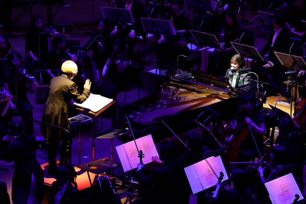 ここから再びライブコーナーへ。4月12日発売の新曲『夢さえ描けない夜空には』と、19世紀を代表する作曲家の一人であるショパンの「英雄ポロネーズ」を軸にした『英雄〜笑っ て!ショパン先輩〜』を披露。なかでも『英雄〜』は、今春に音楽大学を卒業したばかりの 小林萌花のピアノソロでスタートする楽曲。小林萌花のピアノ演奏とオーケストラの夢の 共演に、観客席のファンも真剣な眼差しでステージ上に見入っていた。