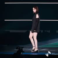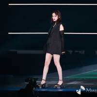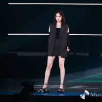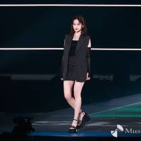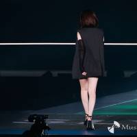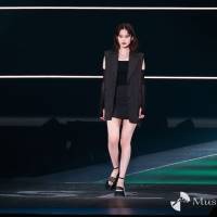 ブランド「SLY」のステージではトップバッターを務めた。黒のロングべストに黒のミニスカを合わせた大人なコーデ。大き目の襟がクールな雰囲気を演出。ミニスカからは美脚も映えた。
