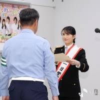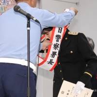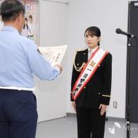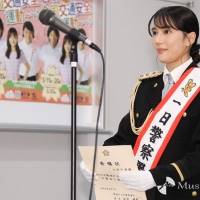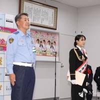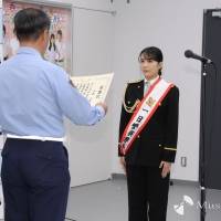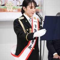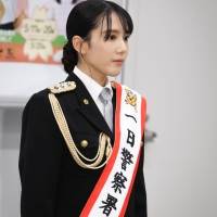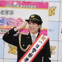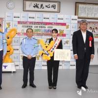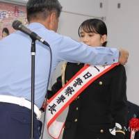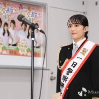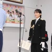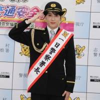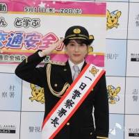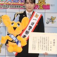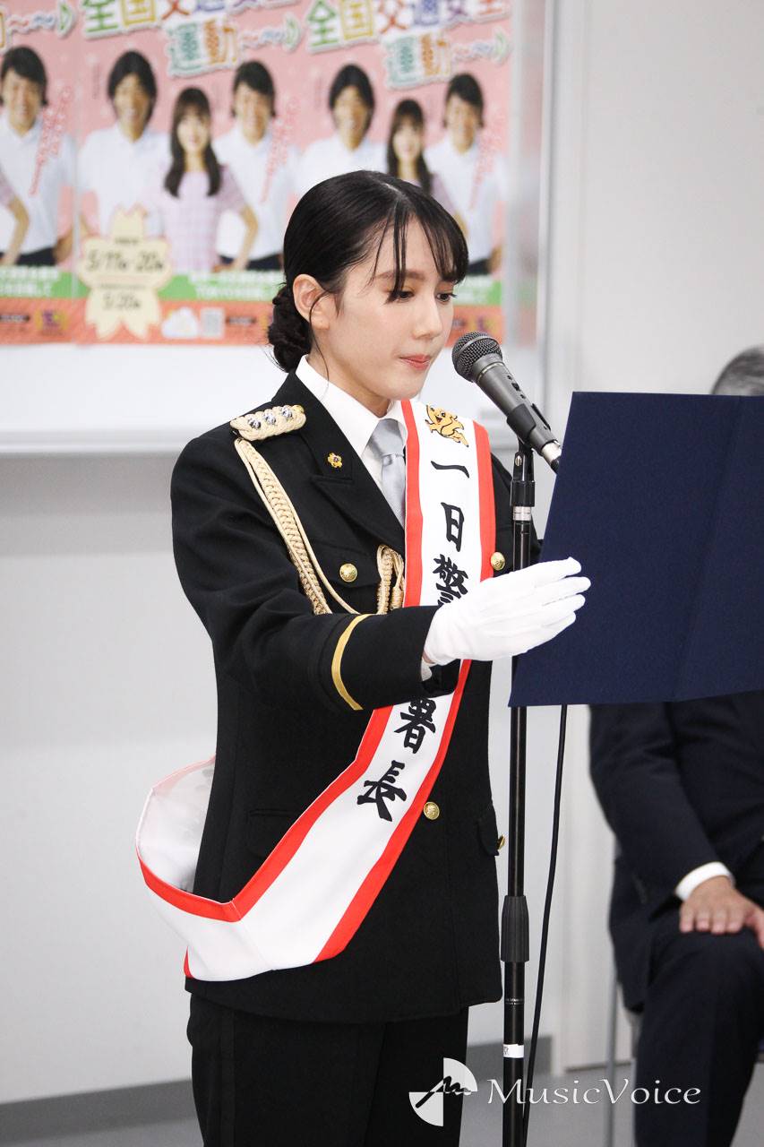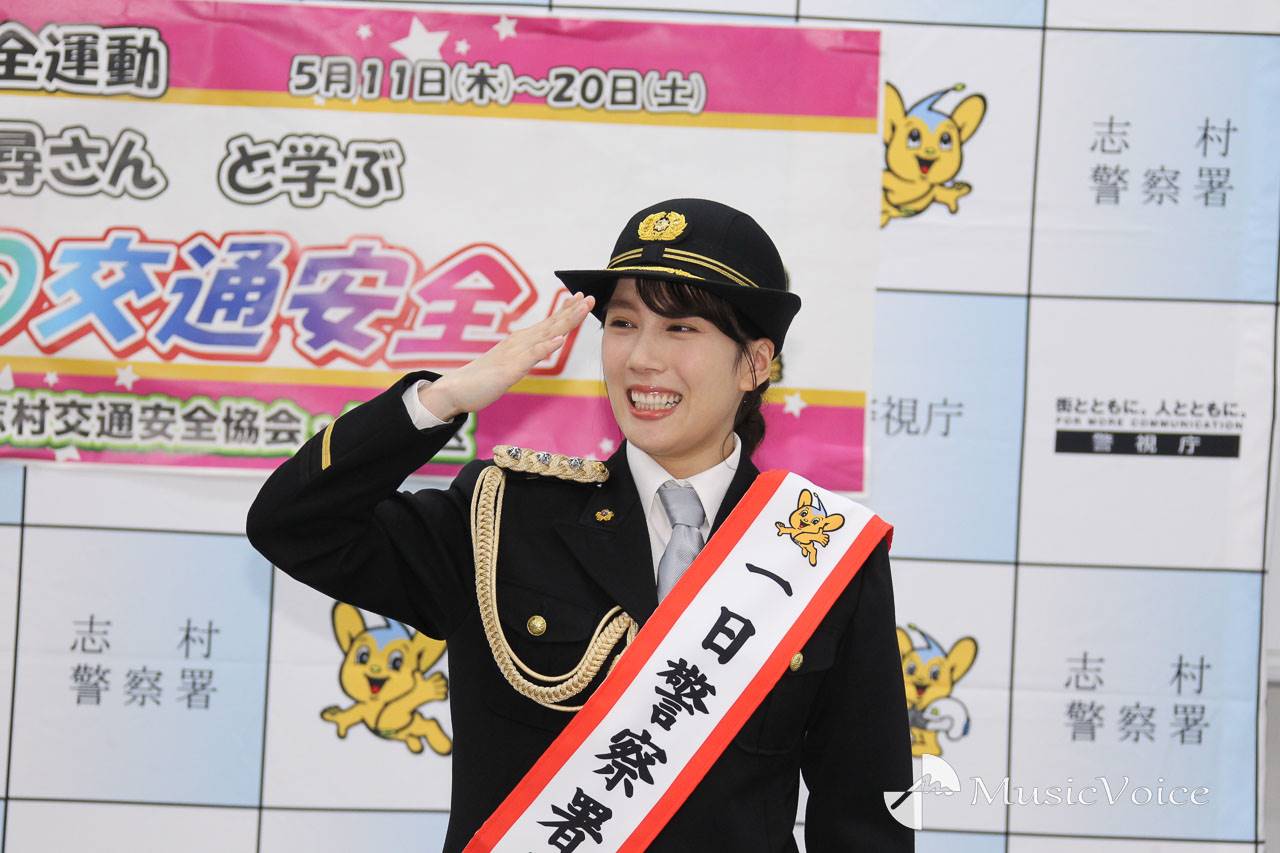 やや緊張した面持ちで、志村警察署長から委嘱状を受け取った後、交通安全宣言を行った。一日警察署長を務めるのは今回が初。制服に袖を通し「背筋が伸びる思いです」と照れた。