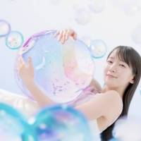 撮影はまずグラフィック撮影から行われた。“うるおい”を表現する球体を抱きしめるカットでは、ふわりと宙に浮いているような浮遊感のあるポーズ取りが難しそうな場面も。しかし、手の合わせ方や足のそろえ方など、カメラマンに積極的に意見を出しながら、いい感じのポジションを探りつつ、撮影。「すごくいいです!」とカメラマンからOKの声がかかると、「よかった〜」と吉岡も思わず安堵の声。