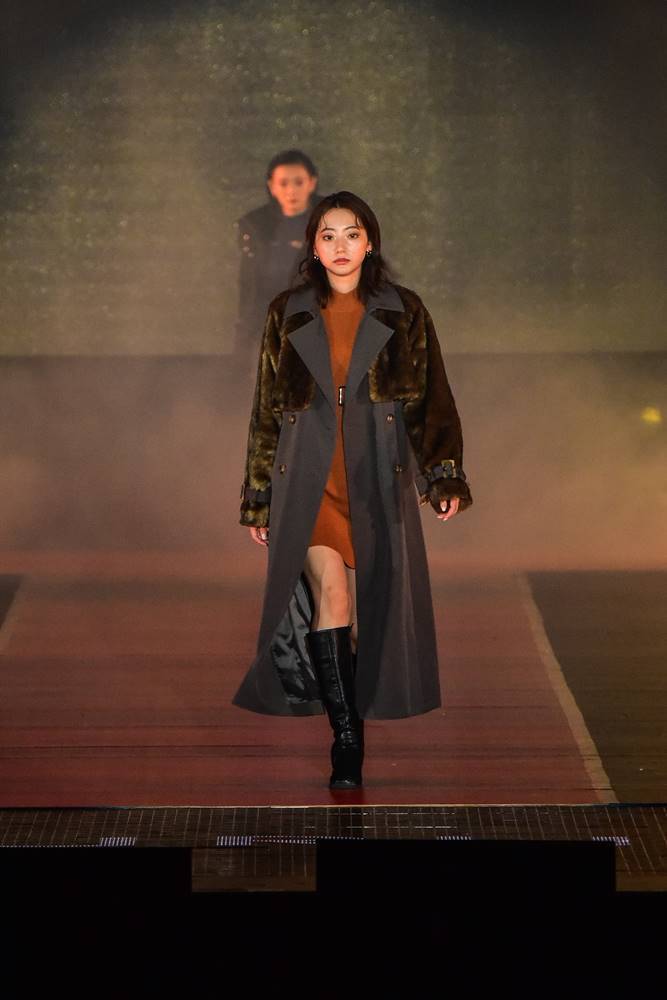 5th SHOWのブランド「MURUA」のステージ。ミニ丈のニットワンピからロングコートとファージャケットをレイヤード。ロングブーツを組み合わせ、全体的にブラウンを基調に明るさ落としたオシャレ感たっぷりの都会的なコーデ。