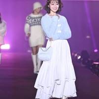TGCのランウェイを歩くのは約6年半ぶり。藤田ニコルがディレクションする「CALNAMUR」のステージではランウェイ映えするアシメスカートと水色のニットを爽やかに着こなし。美しいデコルテもうかがえた。