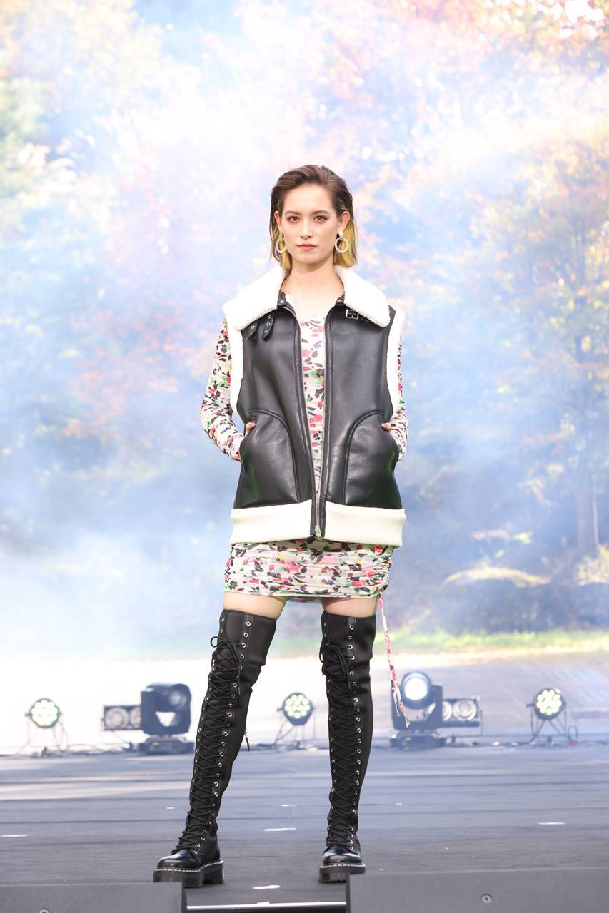 トップバッターは2年連続でトラウデン直美が務めた。タイトなワンピースにレザーベストとニーハイブーツを組みわせたコーデ。髪をオールバックに決め、クールにランウェイ。華々しく幕開けを飾った。
