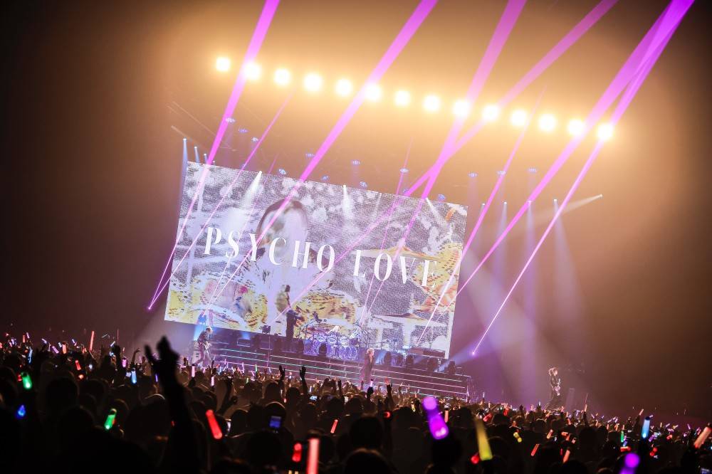 ライブは今年8月にリリースされ、 ツアータイトルにもなっている「PSYCHO LOVE」で幕は開けた。今年1月に行われたライブでは本編の最後に演奏された曲だ。楽曲のスケール感の大きさも相まって、序盤からクライマックスのような盛り上がりを見せた。続いてHYDEの楽曲「6or9」では、オーディエンスのシンガロングと連続して吹き上がる火柱の演出が印象的で、さらに会場のテンションが高まっていくの感じた。HYDEは「最終日、完璧にやり切ってやるぜ!」と意気込みを力強く叫び、「スリリングなバンドですが、しっかり新曲があります!」と告げ、新曲「Tonight, The World Is Mine」を披露。MIYAVIが手がけた疾走感のあるロックナンバーで、バンドに新たな色を加えた。