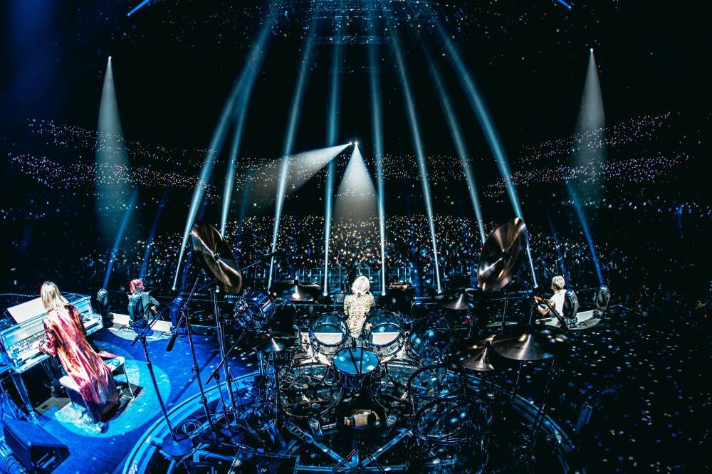ここで11月20日が誕生日だったYOSHIKIをお祝い。ケーキを頬張るYOSHIKIの姿が印象的。そんなお祝いムードで満たされる中、「Shine」へと紡がれていく。今年1月のライブで披露された楽曲で“みんなで歌える曲”をテーマに制作されたライブならではのナンバー。会場はオーディエンスが灯したスマホのライトがキャンドルライトのようで、その美しい光景にYOSHIKIも感動。オーディエンスによるシンガロングも響き渡り、会場が多幸感で満たされていく。