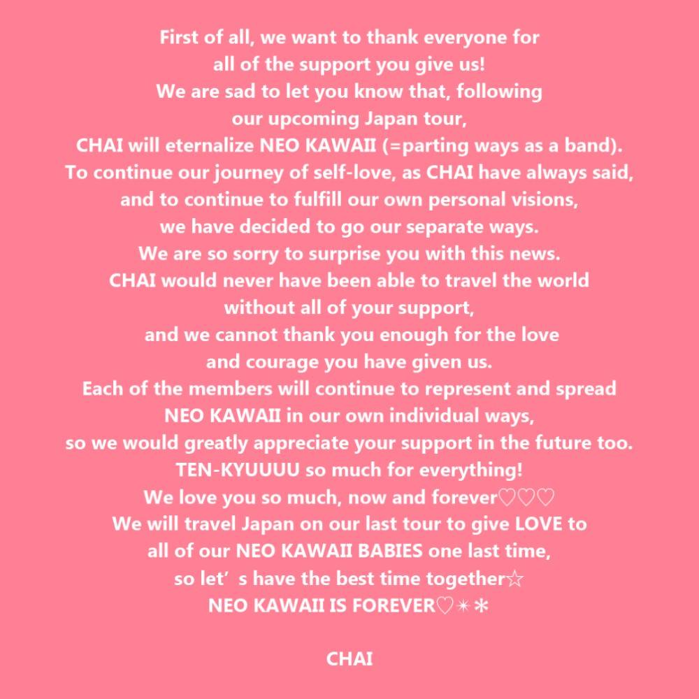 フォトニュース CHAI、バンド活動終了を発表 CHAIメンバーコメント(英語) みんなの意見は?コメントを見る 関連写真・動画 写真一覧 みんなのコメント コメントを書く(ユーザー登録不要) この写真の記事を読むCHAI、バンド活動終了を発表「メンバーそれぞれの道を進むことにしました」 前の写真を見る →