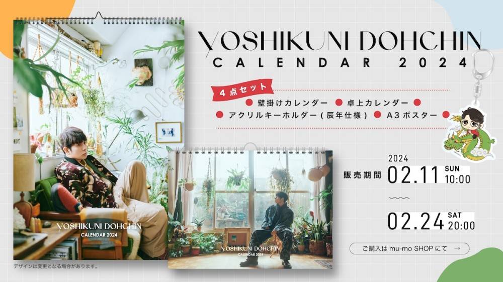 内容は“ナチュラル”にリラックスした堂珍嘉邦のオフ感を楽しめるものとなっている。壁掛けタイプと卓上タイプの2種、新作クーニー(※堂珍のキャラクター名)、アクリルキーホルダー(辰年仕様)、A3ポスターの4点セット。