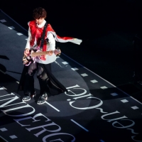 ステージが回転し始めて、火花の特効が炸裂する中で「Killing Me」を投下。スモークも床下から吹き上げ、壮観な眺めとなる。コーラスするkenにhydeが接近、やがてtetsuyaも近付いて、yukihiroの前で全員が集まるフォーメーションに。それを観た観客は、どんな特効に煽られるよりも盛り上がっていた。「自由への招待」へと雪崩れ込むと、まるで無邪気なバンドキッズのような生き生きとした演奏を繰り広げ、伸びやかに歌い終えたhydeは最後にダッシュ、yukihiroとアイコンタクトを取りジャンプダウンして音を止めた。