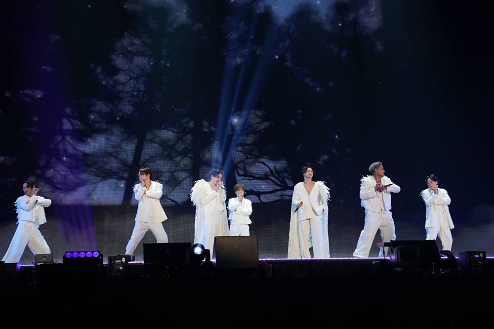 重厚なコーラスが鳴り響く中、メンバーが多種多様な神々に扮したCG映像による壮大な世界観でライブは始まる。ステージに現れた7人が巨大スクリーンに映し出されるとたちまち歓声が鳴り、そのまま低音が響くアッパーチューン「DEVELOP」を青いレーザーの光と炎の特攻演出とともに聴かせ、一気に会場の熱を高めた。「いくぞファイナル!準備はいいか!」というΦMIのシャウトで始まったのは代表曲の一つ「J.S.B. DREAM」。息の合った掛け合いと手で示される“∞”のマークで、さっそく会場が一体に。そこから続けざまにエッジーなギターがかき鳴らされる「STORM RIDERS feat. SLASH」でそれぞれが広いステージを駆け回る。次いで最新アルバム収録の「CRAZY-CRAZY-CRAZY」では、ボーカルとパフォーマーが各々モニター越しのパフォーマンスで沸かせる。スタンドマイクを使ったパフォーマンスで人気の「Eeny, meeny, miny, moe!」では、途中のオーセンティックなダンストラックでも魅せる。そして最新アルバムからの「You got my mind」は洋画風に縦字幕の映像と女性ダンサーとのコラボでラブストーリーの世界観を表現。直後、スクリーンに流れ星が流れる。「アリーナ、スタンド、最上段の皆さん。そして配信をご覧の皆さん、誰も置いていきません。一緒に行こう!」と客席に投げかけるメンバーの姿がスクリーンに映し出される中、心温まるようなバラードのアレンジから始まる「R.Y.U.S.E.I.」が歌われる。輝く星々のような観客たちのライトに包まれ、いつまでも色褪せない大ヒットチューンを“今”の形で届けた。
