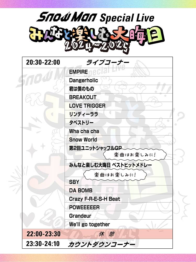 フォトニュース Snow Man、YouTube生配信「みんなと楽しむ大晦日!2024 – 2025~」セットリスト公開 「みんなと楽しむ大晦日!2024 – 2025~」セットリスト みんなの意見は?コメントを見る 関連写真・動画 写真一覧 みんなのコメント コメントを書く(ユーザー登録不要) この写真の記事を読むSnow Man、YouTube生配信「みんなと楽しむ大晦日!2024 – 2025~」セットリスト公開