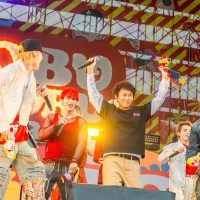 最後は、JO1がカバーリリースをしている「WOW WAR TONIGHT 〜時には起こせよムーヴメント (JO1 ver.)」を披露。原曲は『ごぶごぶフェス』CEOである浜田雅功が参加する音楽ユニットH Jungle With tの代表曲であり、会場の誰もが知る名曲。JO1のアレンジによる新しい息吹が加わり、途中にはラップやダンスブレイクも取り入れられた構成となっている。曲の中盤、観客の視線が集まる中、後方から浜田雅功本人がサプライズで登場。JO1のメンバーと肩を並べて歌い上げるというまさかの共演に、会場は大興奮。