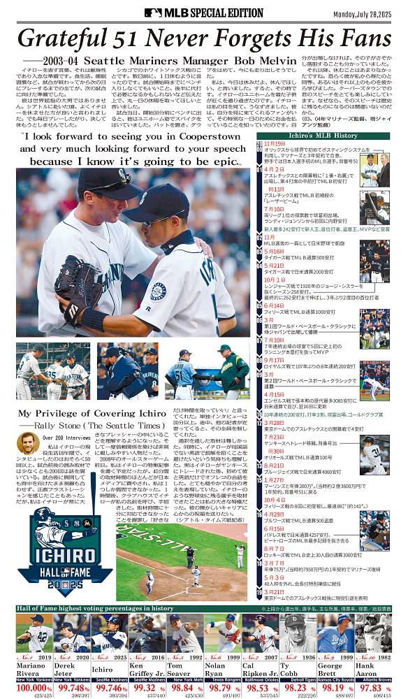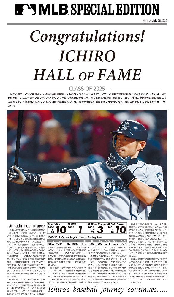 スポーツ イチロー⽒、アジア⼈初となる⽶国野球殿堂⼊り 記念企画プロジェクト始動 編集部 25年07月29日17時16分 読了時間:約13分 イチロー氏、シリアルナンバー入り特別号外 シリアルナンバー入り特別号外『MLBTM SPECIAL EDITION』 シリアルナンバー入り特別号外『MLBTM SPECIAL EDITION』 シリアルナンバー入り特別号外『MLBTM SPECIAL EDITION』 1 2 この記事の写真 記事タグ イチロー > スポーツ> イチロー⽒、アジア⼈初となる⽶国野球殿堂⼊り 記念企画プロジェクト始動 コメントを書く(ユーザー登録不要) 前後の記事 トータス松本&スカパラが大滝詠一さんを語る 秘話満載の“カバーナイト” 「a-nation 2025」 第三弾出演アーティスト発表 TREASURE、NCT WISH、Hey! Say! JUMP出演決定