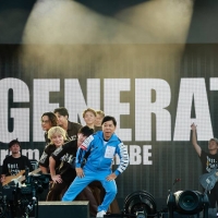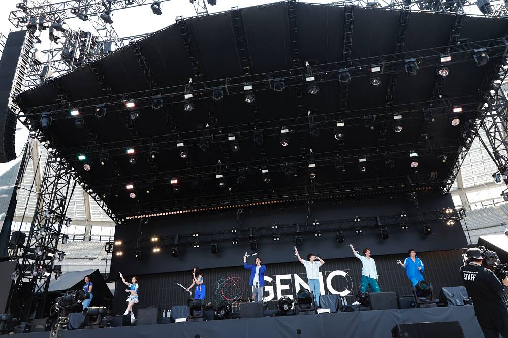 繰り返される「GENERATIONS…」のアナウンスに、美しいピアノの音が流れると、GENERATIONSの6人がステージ高くにリフトアップ。バンドの生演奏をバックに、「Evergreen 2.0」を清涼感たっぷりに届けていく。続く客席との「GENERATIONS!」のコール&レスポンスを繰り広げた「ALRIGHT! ALRIGHT!」など、曲中にアクロバットを交えたダンスパートが組み込まれているのがGENERATIONS流。水分補給を促すMCのあとは「暑苦しい夏に涼しくなってもらいたい」と、数原龍友がプロデュースを担当した「Summer Vacation」を贈り、ハッピーなサーフロックで場内のテンションを上げていく。そして「Choo Choo TRAIN」に続こうとしたところで、突然、ナインティナインの岡村隆史が「オカレーションズです!」とステージに乱入。岡村を先頭に「Choo Choo OKAMURA TRAIN」を披露した。岡村が繰り出すダンスに合わせてメンバーも振りを変え、最後は昔キッズダンサーとして岡村と共演経験のある小森隼が岡村をお姫様抱っこ。スタジアム中が湧いた意義深いサプライズのあとは花道を駆けながら「Y.M.C.A.」をオーディエンスと共に踊り、「NOW or NEVER」ではしゃがんでジャンプ!を繰り返して、熱い一体感を生み出していった。