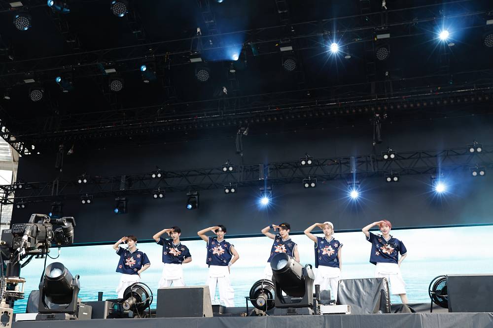 日韓合同オーディション・プロジェクト『Nizi Project Season 2』から誕生したグローバル・ボーイズグループのNEXZは、ステージにリフトアップで登場。電話の音から始まる「Simmer (JP ver.)」を皮切りに、おそろいの白のキャップと息の合った動きにアクティングも交え、ストーリーを感じさせるパフォーマンスを披露する。最新曲「One Bite」とグループにおけるポジションを伝える自己紹介を挟み、「僕たちNEXZと一緒に、忘れられない夏の思い出を作りましょう!」とリーダーのTOMOYAが伝えての「O-RLY? (JP ver.)」では、人間ピラミッドの大胆パフォーマンスも。緻密なボーカルハーモニーが印象的な「BURNING BLACK」に続き、メンバーが作詞をした「Next Zeneration (The Performance ver.)」では、客席に「NEXZ!」のコールを巻き起こし、スパークラーの火花をぶち上げた。