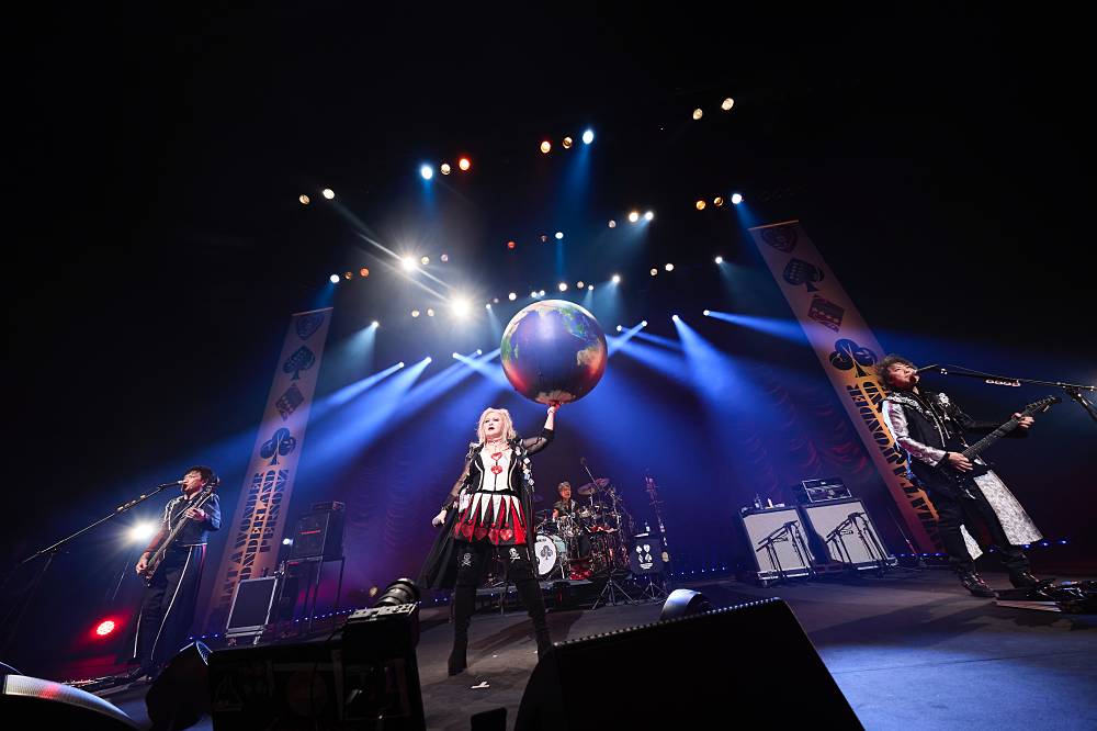 「もう一曲新曲いくからね!」の言葉でスタートした「THAT’S MY TREASURE」は、新アルバムからの楽曲で、“新しい宝物を見つけに行こうよ”という歌詞もドライブ感あふれるタイトな演奏もPERSONZらしさ満載のナンバー。また「PERSONZが一番初めに地球儀を飛ばしたのがこの曲です。もう一度飛ばしていいでしょうか」と紹介されたのは、1stアルバム『PERSONZ』(1987年)に収録されていた初期の代表曲「Freedom World」。約40年間演奏してきた人気曲だけに、JILLもフェイクを多用するなど、4人ともこの曲はもはや身体の一部なのでは?というくらいのこなれ感。客席を大きな地球儀が飛び回る光景はこの日二度目。40年前に書かれた歌詞のピースフルなメッセージは、今もまったくブレていない。