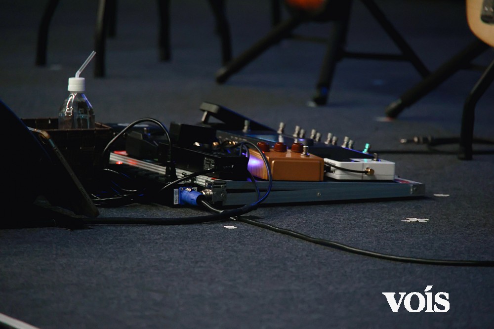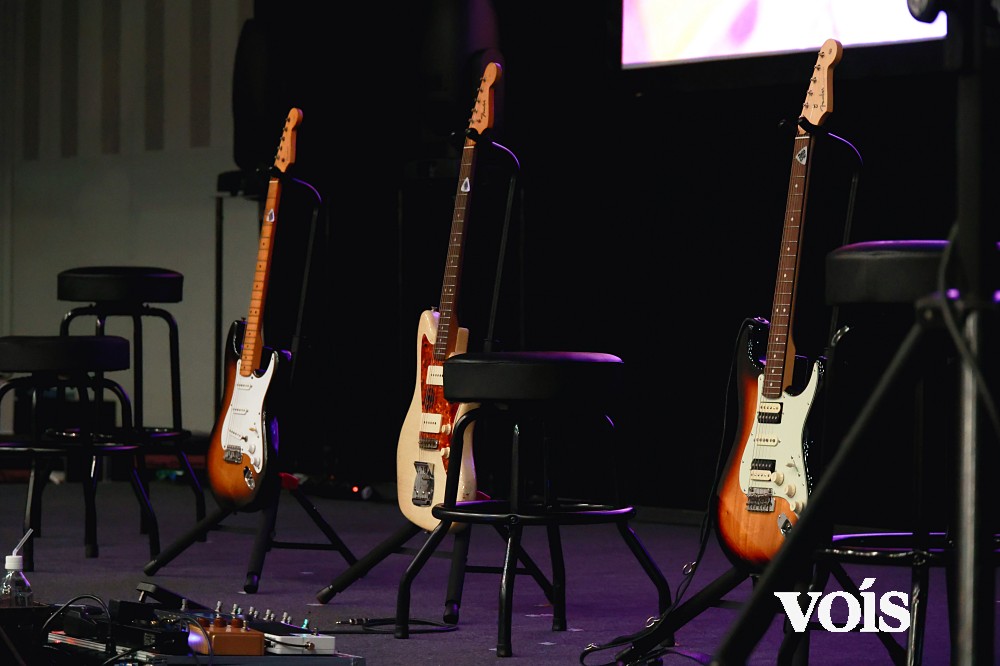 HISASHIがこの日使用した楽器。一番奥が初めて購入したフェンダーストラトキャスター