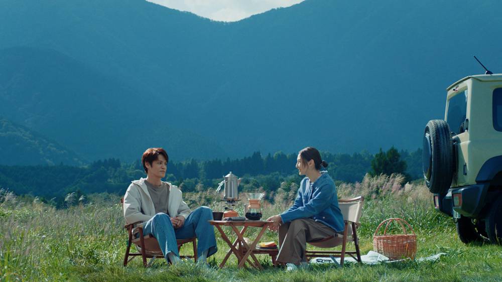 爽やかなブルーのデニムジャケットを羽織り、アウトドアスタイルで登場した北川。最初の撮影は、車から降りて景色に感動するシーンだったが、まるで実際に富士山を目の前にしているかのような自然な演技に、監督から「素晴らしい!」の一言があがった。続けて、アースカラーを基調としたスポーティな服装を身にまとい、宮野が登場した。約3年前のドラマで共演して以来となる二人は、「お久しぶりです!」とお互いに手を振りながら笑顔で声を掛け合い、再会を喜ぶ姿が印象的。