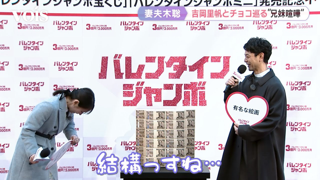 「ジャンボきょうだい」として「ジャンボ宝くじ」のCMに出演している妻夫木聡と吉岡里帆。CMのテーマにちなんで「お互いの想い」を川柳にして発表。妻夫木は共演歴が長いものの、いまだにバレンタインチョコをもらっていないとして「義理もないのかよ!」と“クレーム”を入れると「小っ恥ずかしい」と返す吉岡。「事務所に郵送しようか」とボソリ。すかさず「手渡してよ!」とすると妻夫木。