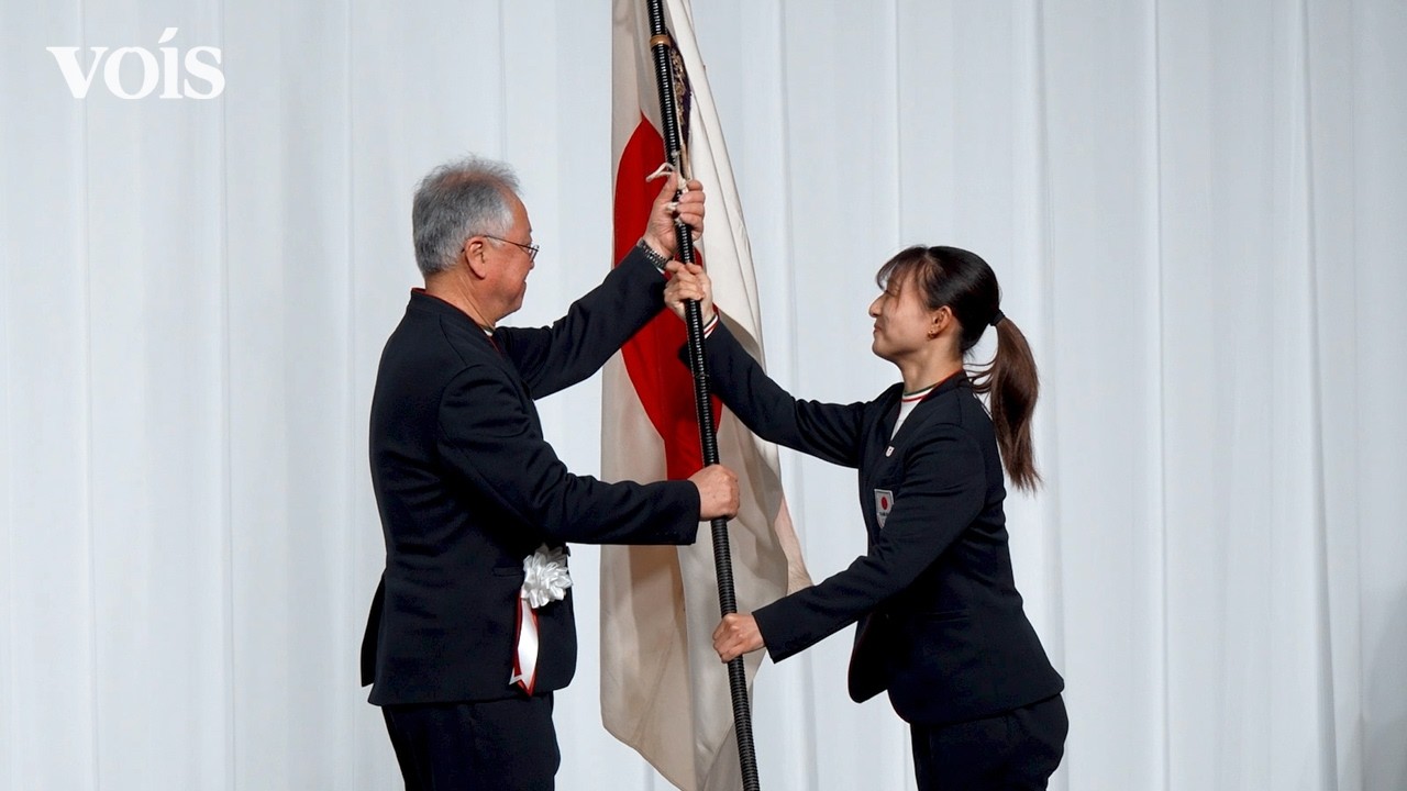 日本代表選手団が声援受ける、フィギュア坂本花織が旗手代行で決意表明「勇気を届けたい」
