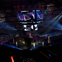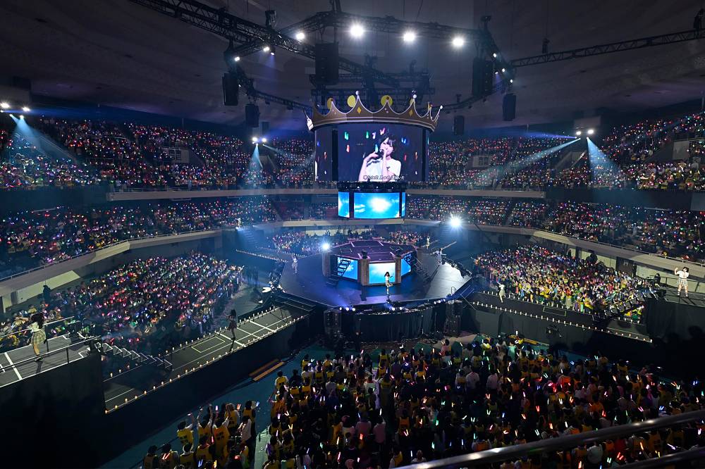 360°観客に囲まれたステージに登場した≒JOY。彼女たちは「日本武道館行くぞー!」の声を合図に1stソング『≒JOY』でライブの幕を開けた。曲中には「ニアジョイお誕生日おめでとう!」という掛け声とともに金の紙吹雪が舞い、早くも大きな熱気が発生。『スイートシックスティーン』ではこの日ならではの替え歌も披露され、続く自己紹介パートではメンバーそれぞれがテンション高くファンへ呼びかけた。