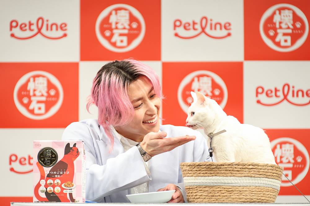 トークセッションでは「懐石」アンバサダー2年目を迎える佐久間大介が登場。佐久間の愛猫ツナくんとシャチちゃんについて聞かれると、「朝起きるとリビングに猫ちゃんたちがいるんですが、もはや「懐石ほしい!」と話しかけてくるというか(笑)。夢中になってすごい勢いで食べていて、ゆっくり食べなと言うくらいです」と愛猫への想いをにじませた。