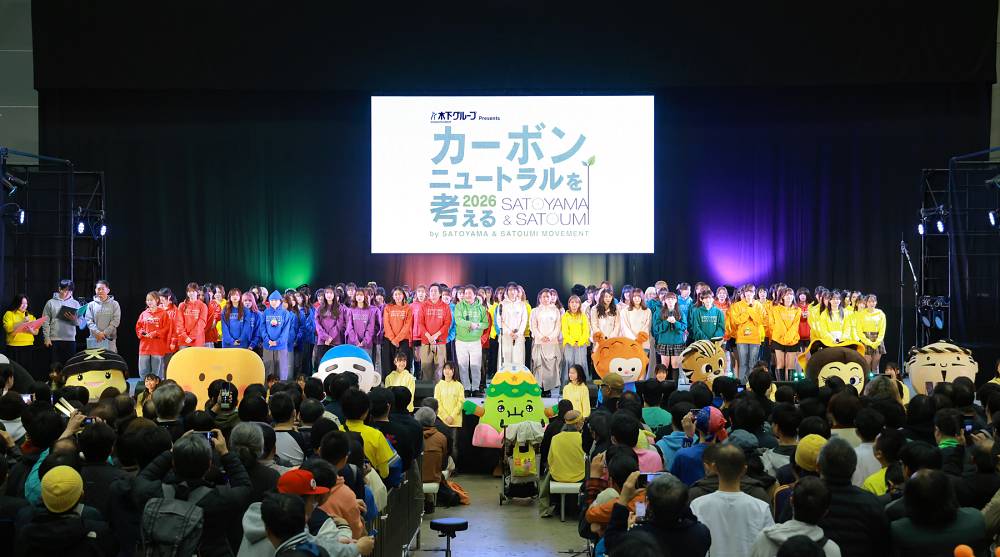 アップフロントグループ主催のイベント「木下グループ Presents カーボンニュートラルを考える 2026 by SATOYAMA & SATOUMI movement」が、千葉・幕張メッセ 国際展示場ホール3でスタートした。期間は2026年3月20〜21日。本稿では、初日に行われた「オープニングセレモニー」の模様をレポートする。