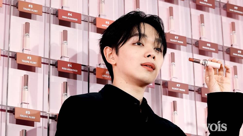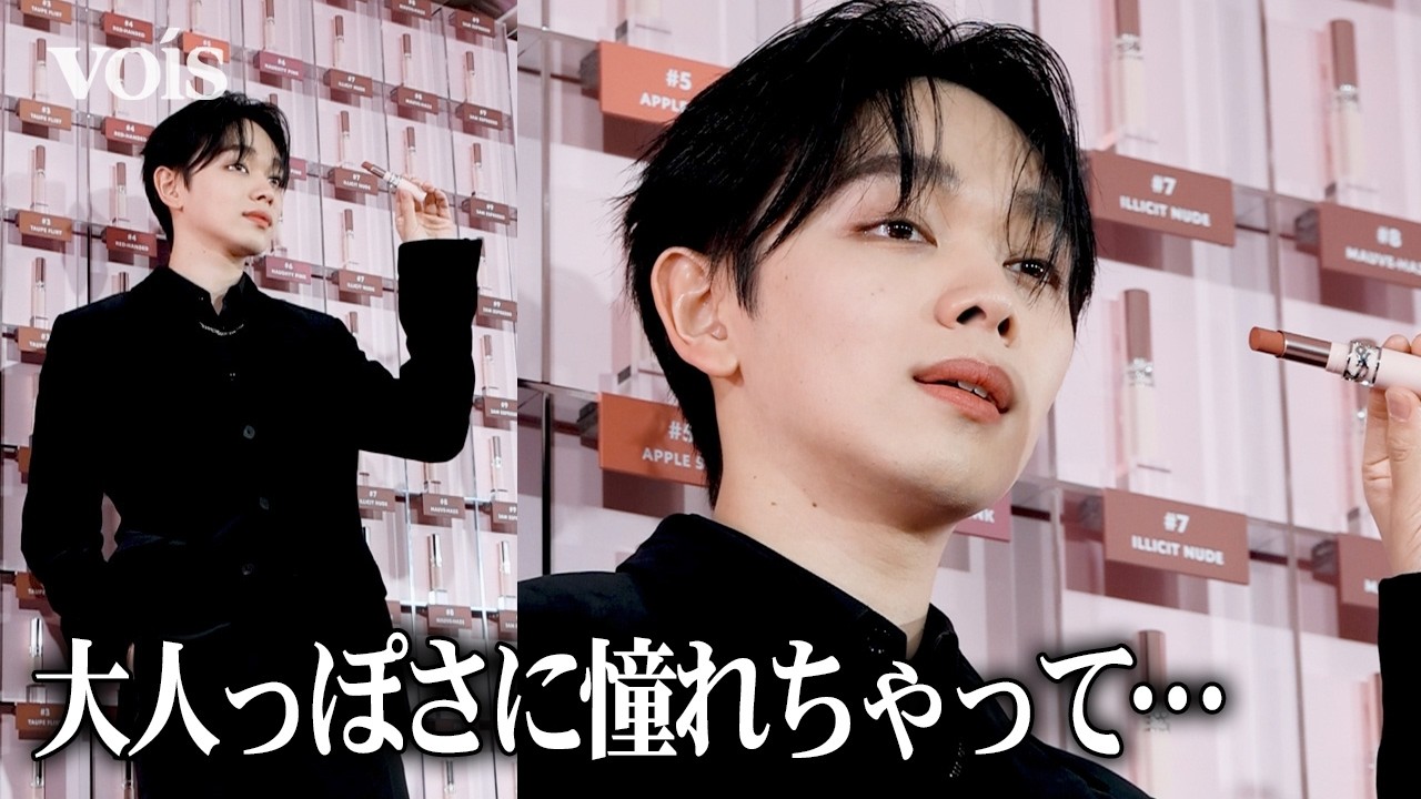 この日のメイクのポイントを「上品なメイクです。僕はまだ22歳なんですけど、ちょっと大人っぽさに憧れているので、少し上品なメイクをしていただきました。今つけているYSL ラブヌードのリップも、赤すぎず、血色のいい人に見えるようなナチュラル感もあって、大人っぽい感じなので、すごくいいなと思っています」