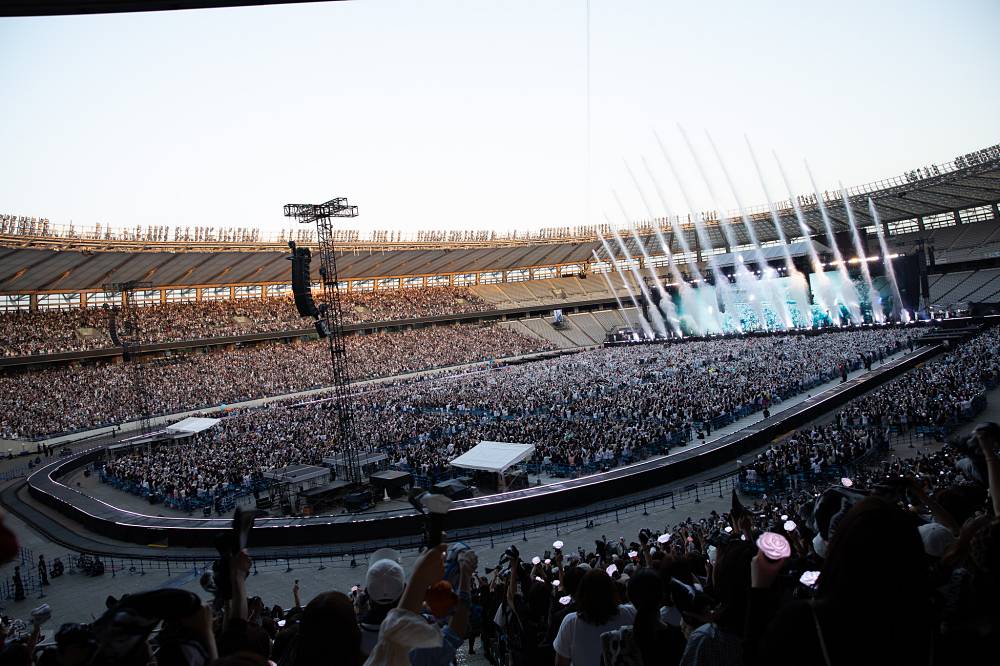 「LET'S PARTY」からはムービングステージで会場の奥まで向かい、「JSB Blue」で青空に突き抜けるような爽快なサウンドを届ける。「Welcome to TOKYO」「FIGHTERS」「1st Place」を経て、「Feel The Soul」では青空の下に響く約5万人のシンガロングを受けながら優しい眼差しを向ける7人。メインステージでは「J.S.B.」と書かれた青いフラッグが振られ、カラフルなバルーンがアリーナを弾む。「(YOU SHINE)THE WORLD」ではMATEのタオルが勢いよく回され、大阪公演に続きウォーターキャノンが噴射。スタジアム公演ならではの大迫力の演出の数々で会場のボルテージを引き上げた。